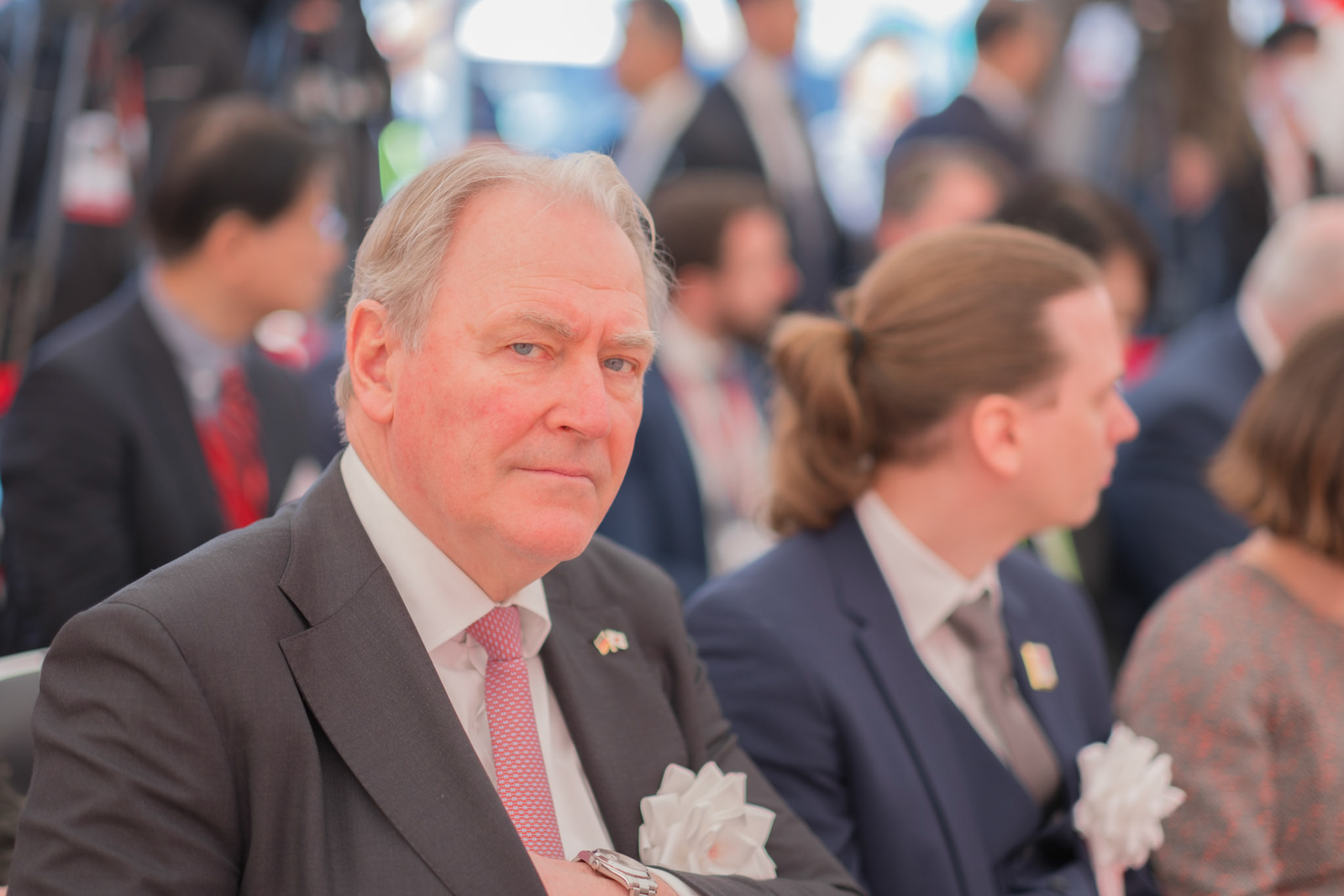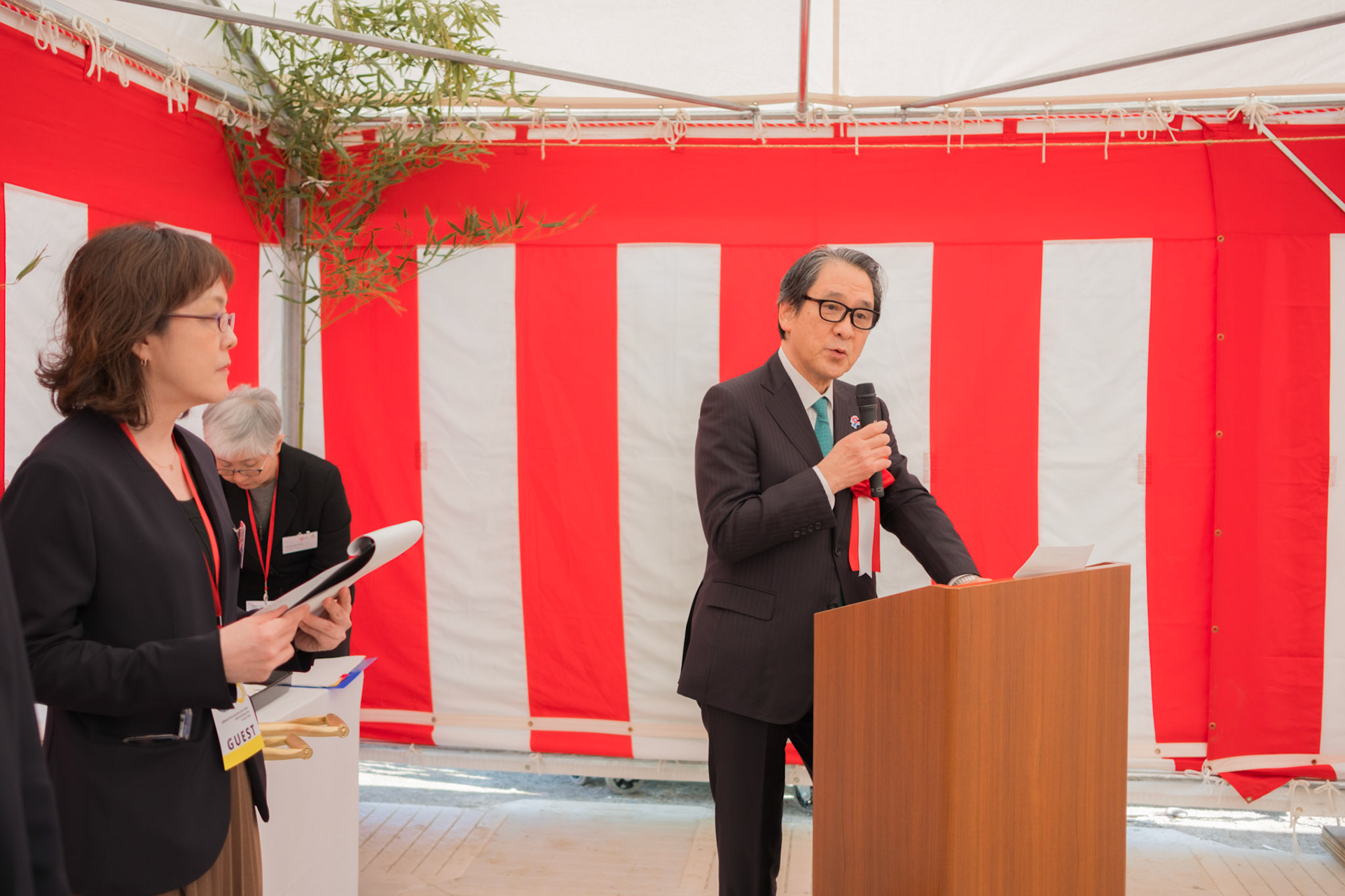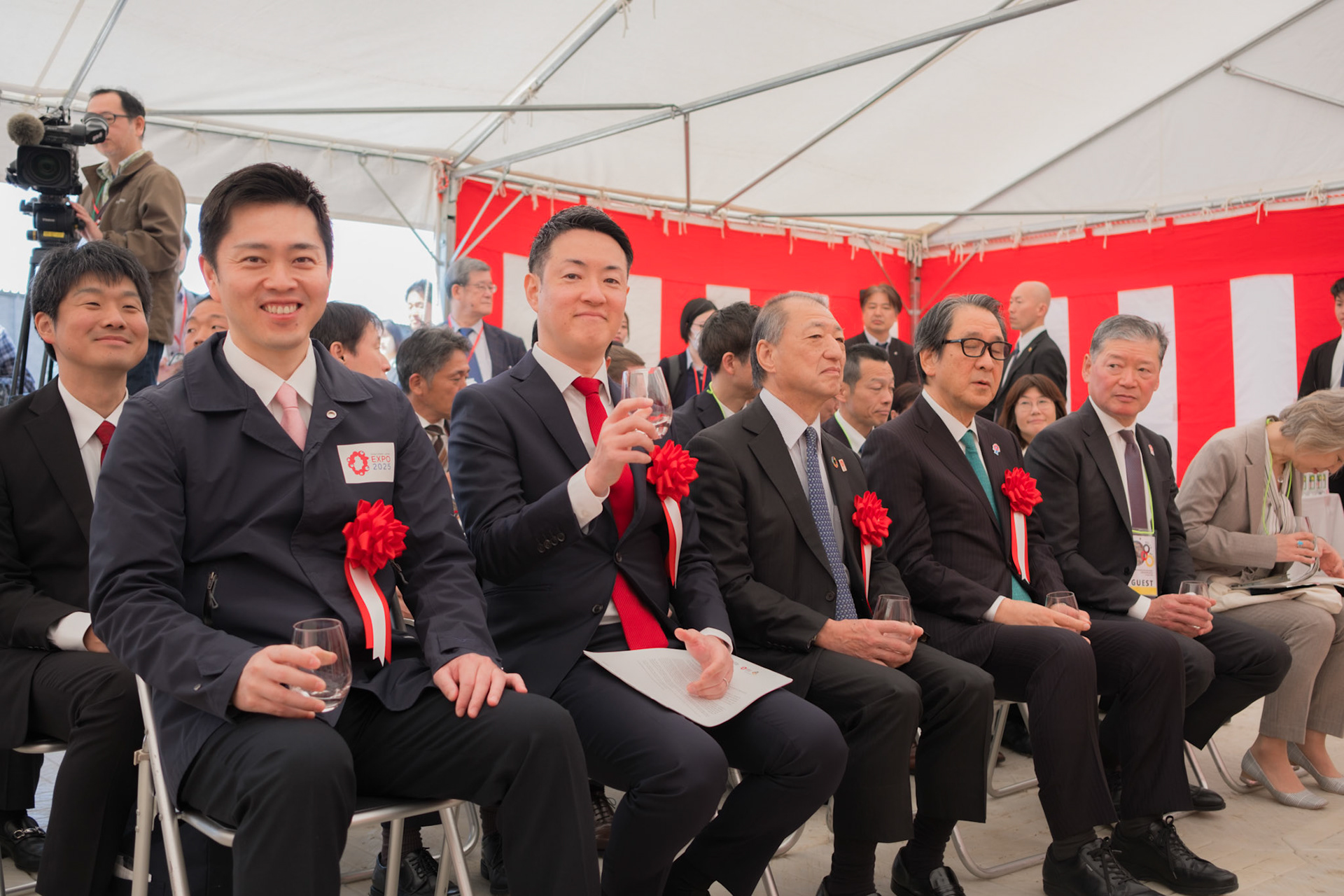 The groundbreaking event ceremony for the 2025 German Pavilion in Osaka, Japan, marked by the presence of distinguished guests, including Osaka Mayor Mr. Hideyuki Yokoyama (横山 英幸さん), Osaka Governor Mr. Hirofumi Yoshimura (吉村 洋文さん), and Ms. Melanie Saxinger, Consul General of the Federal Republic of Germany in Osaka.